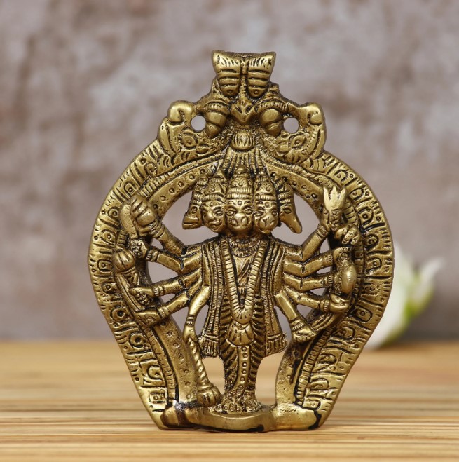 Product Description - When Hanuman, Hayagreeva, Narsimha, Garuda, and Varahswami come together on one body, it is the formation of the Panchamukhi Hanuman– considered one of the most powerful versions of Hanuman, this Golden brass Lord Panchmukhi Hanuman statue is an extremely auspicious idol to keep at home. Handcrafted with pure brass, the work on the statue is nothing short of incredible– from the facial features to the arch within which the god resides, this is an idol that you will want to own! Whether you choose to keep it in your pooja room or your living space; that is a choice we leave up to you! Exquisitely designed and intricately crafted, it makes for a perfect gifting option. This showpiece is handcrafted intricately by our skilled artisans. You can find many more god idols and figurines in different avatars on our online portal in various colors that suit your home or office interior.