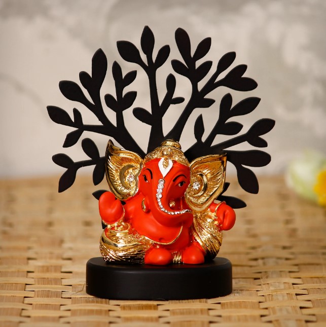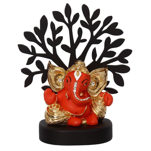 Package Content - One Gold Plated Orange Kaan Ganesha Decorative Showpiece with Wooden Tree for Home/Temple/Office/Car Dashboard