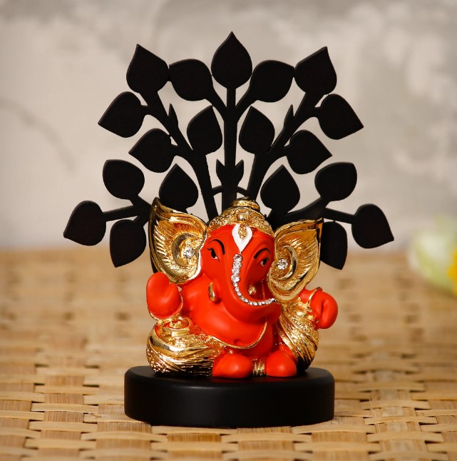 Package Content - One Gold Plated Orange Kaan Ganesha Decorative Showpiece with Wooden Tree for Home/Temple/Office/Car Dashboard