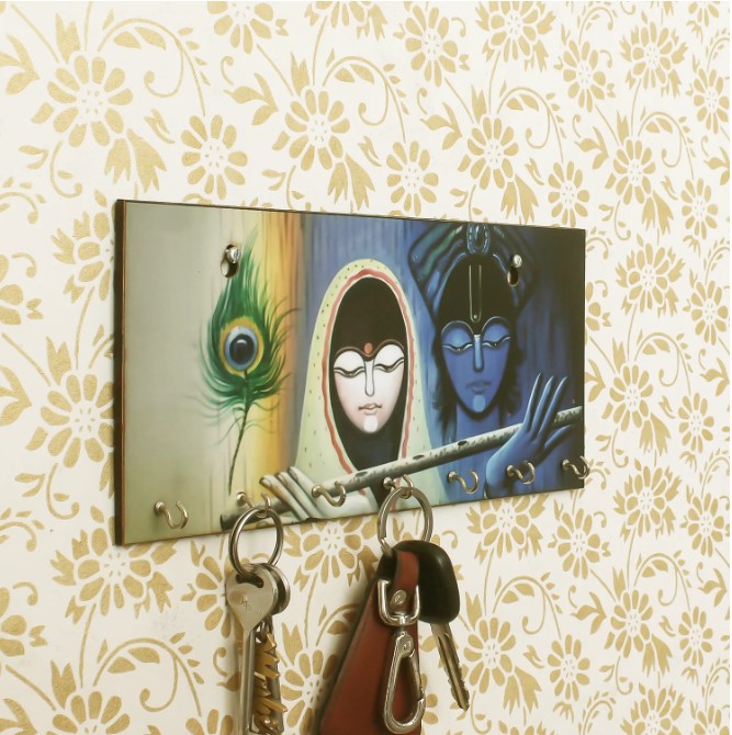 Package Content - One Radhe Krishna Theme Wooden Key Holder with 7 Hooks