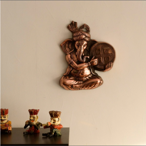Product Description - Lord Ganesha is said to bring good luck and prosperity into your lives. Wondering what to buy as a gift for a dear friend who has recently purchased a new home? Why not consider our Lord Ganesha wall hanging, made using high-quality brass? The Ganesha in this wall hanging brings a sense of whimsy to your interiors because he sits in the garb of a musician, lost in the music being created by his daily. Our Brown Phagdi Lord Ganesha Tambourine/Dafli musical metal wall hanging" is the best showpiece that comes in brown color. This art piece surely grabs attention in your living room. Religious wall décor has always been preferred by many and it also stands as a great gifting option for your friends and family. It serves as a great gift, especially around religious celebrations and festivities. Each religious wall hanging is diligently handcrafted by skilled artisans from the house of using various traditional techniques.