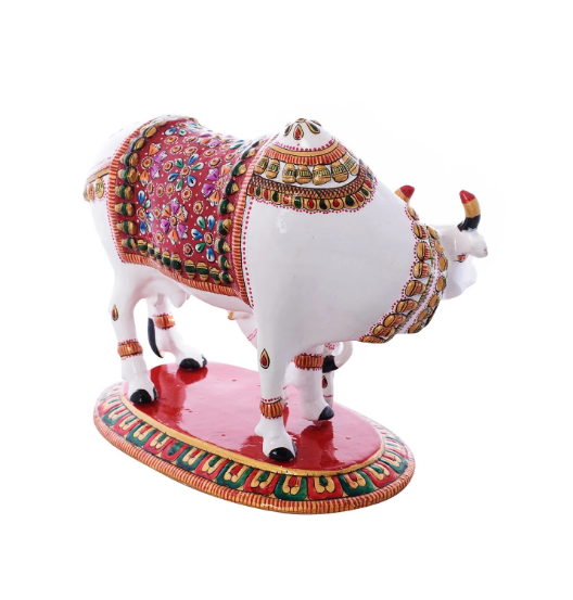 Product Description - The unique creation of meenakari metal white, green and red Kamdhenu cow & calf is an amazing symbol of holyness and culture that has been followed for years now. This figurine showcases the motherly figure of the cow that communicates the sentiments of people with Gaumata. These figurines are the most loved home decoration items that people adore to decorate their home with and also their puja ghar. This can also be a great gift option when you visit your relative's place for a religious function or even for a house warming celebration. These creations are made by experienced artisans at the home of using several antique methods.