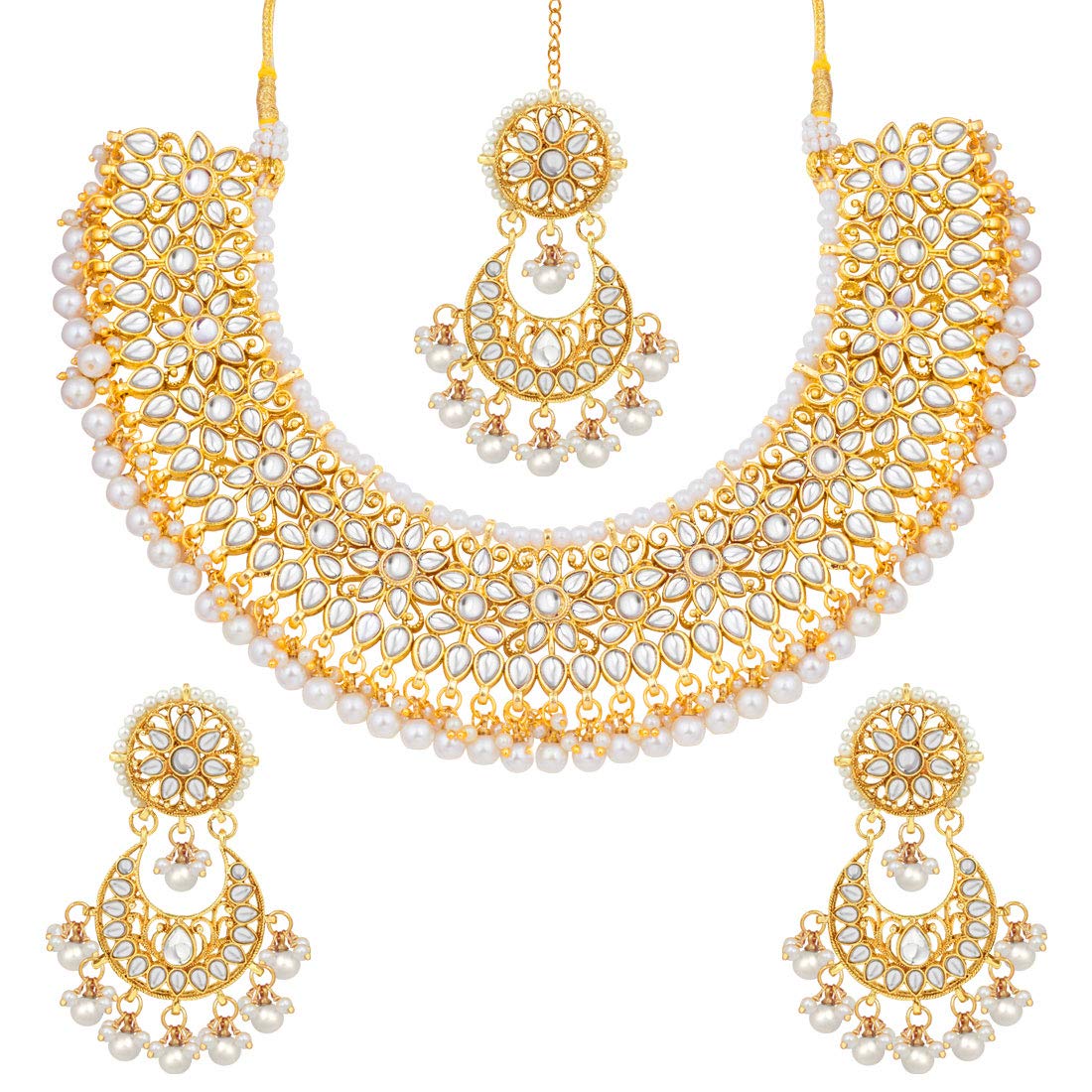 Gold Plated Kundan Choker Necklace Earrings with Maang Tikka Jewellery Set for Women