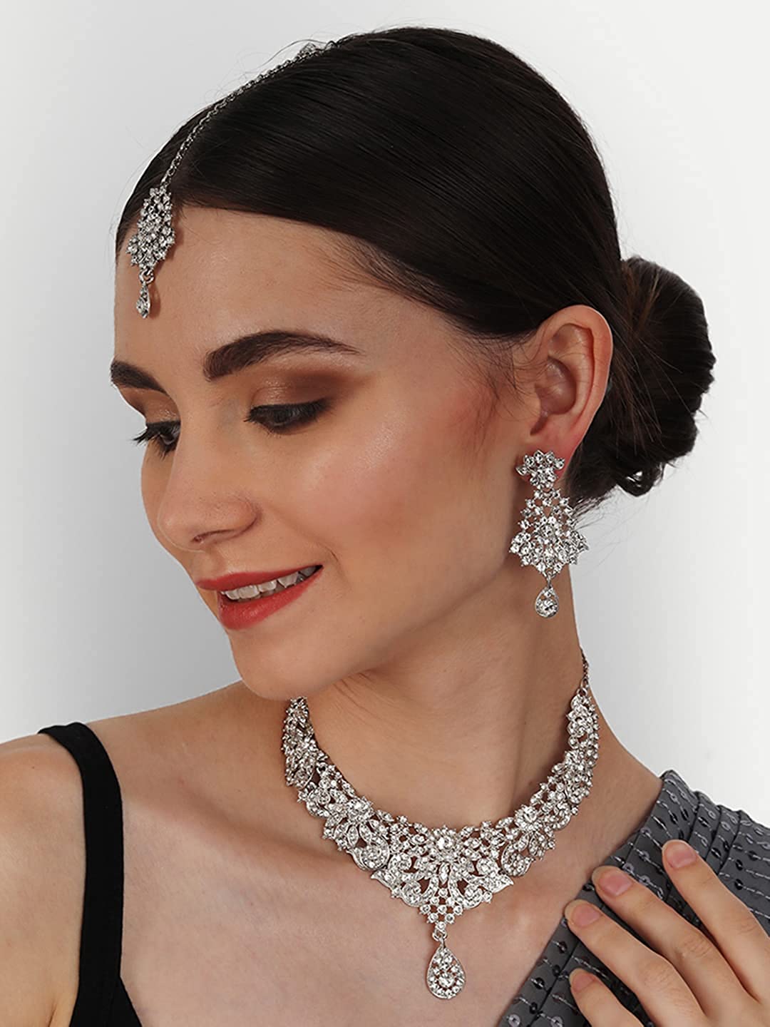 - About Product :- Colour : Silver, Material : Alloy, Plating : Silver Plated; In The Box :- 1 Necklace + 2 Earring + 1 Maang Tikka