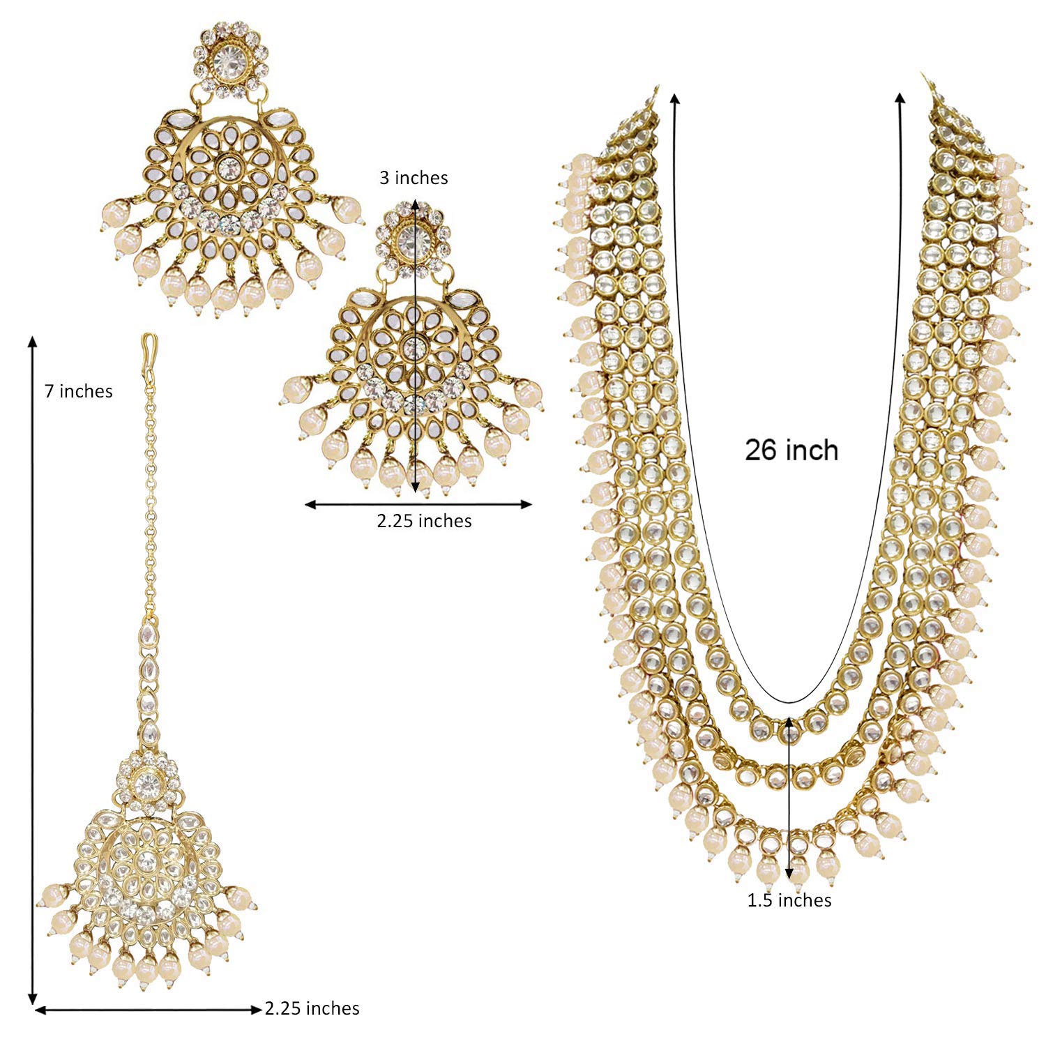 - Dimension: long necklace length - 66.04 cm, choker necklace length - 25.4 cm x width - 7.62 cm, earring Height - 7.62 cm x width - 5.71 cm, Mangtika length - 17.78 cm x width - 5.71 cm