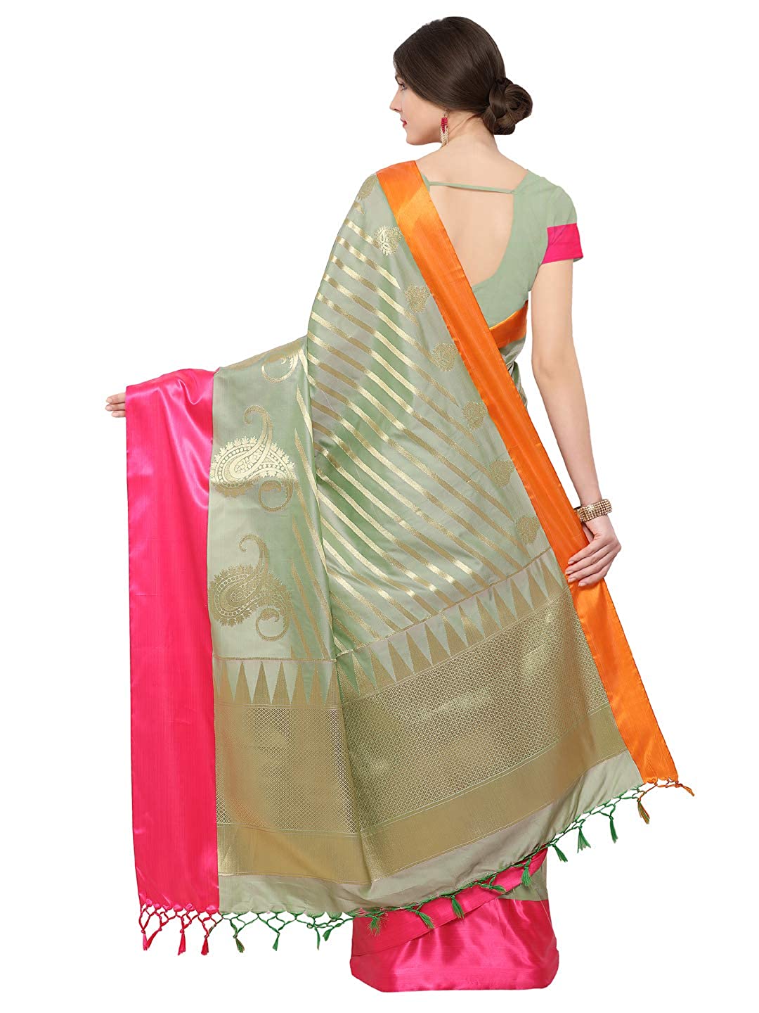 • Border & Pallu Details- Border Color: Pink | Border Work Type: Woven Plain Satin | Pallu Color: Golden | Pallu Work Type: Zari Woven Geometric Design