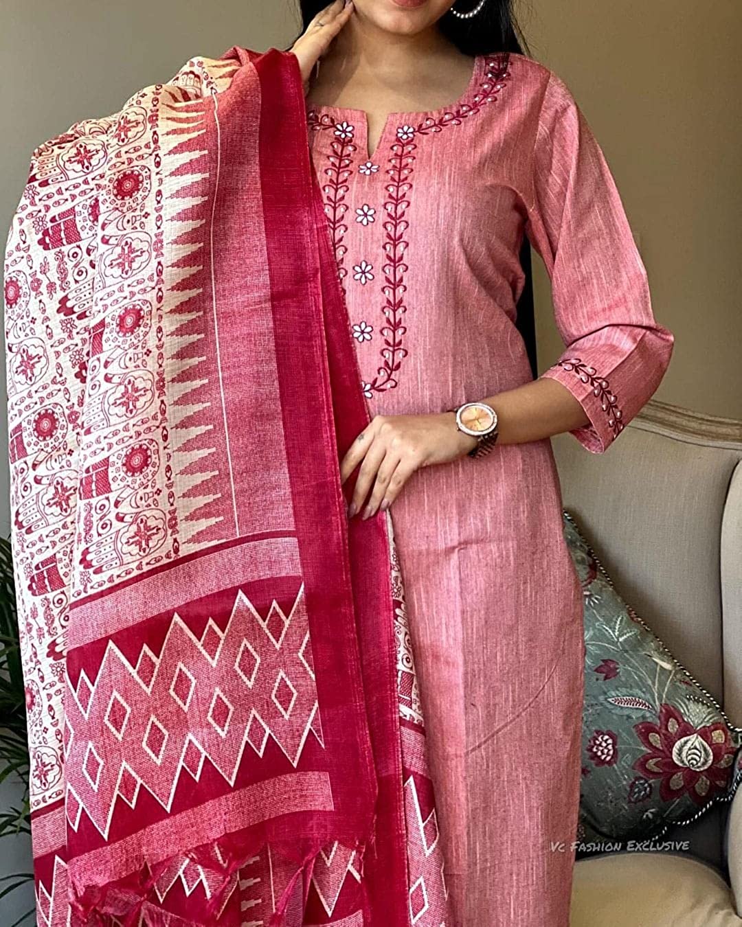Cotton Classy South Khadi Embroidery Suit with Khadi Silk Dupata Set Peach Kurta for Womens Girls Casual Office Festive Function wear Kurti