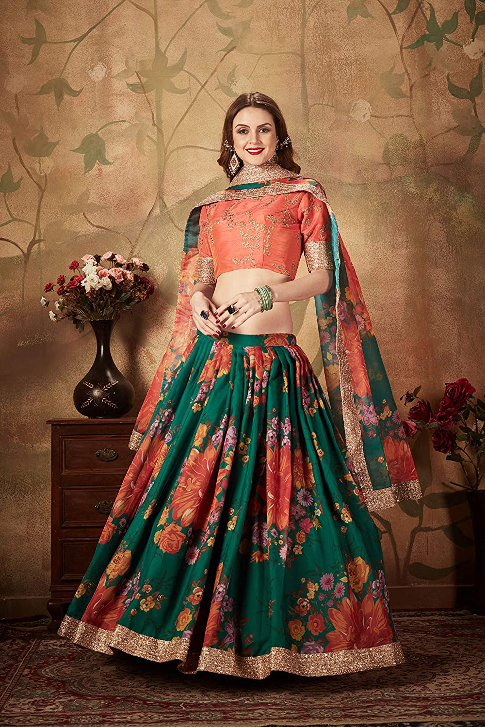 - Lehenga Work: Floral Digital Print with Border Dori & Sequins Embroidery; Blouse Work: Dori, Zari & Glitter Sequins Embroidery; Dupatta Work: Floral Digital Print, Dori & Sequins Embroidery