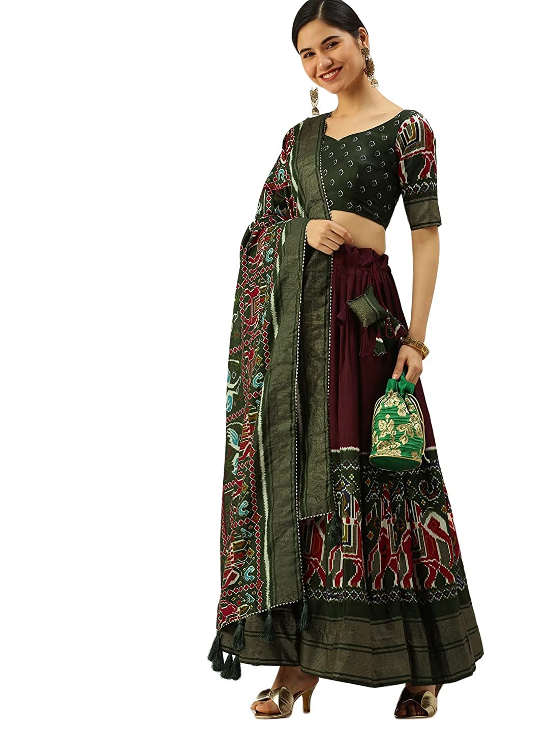 - ✔Lehenga Work :Patola Print and Foil Work Blouse fabric : Gola Silk Dupatta Work : Digital Patola Print with Gotta Patti Lace Border also comes with tassels