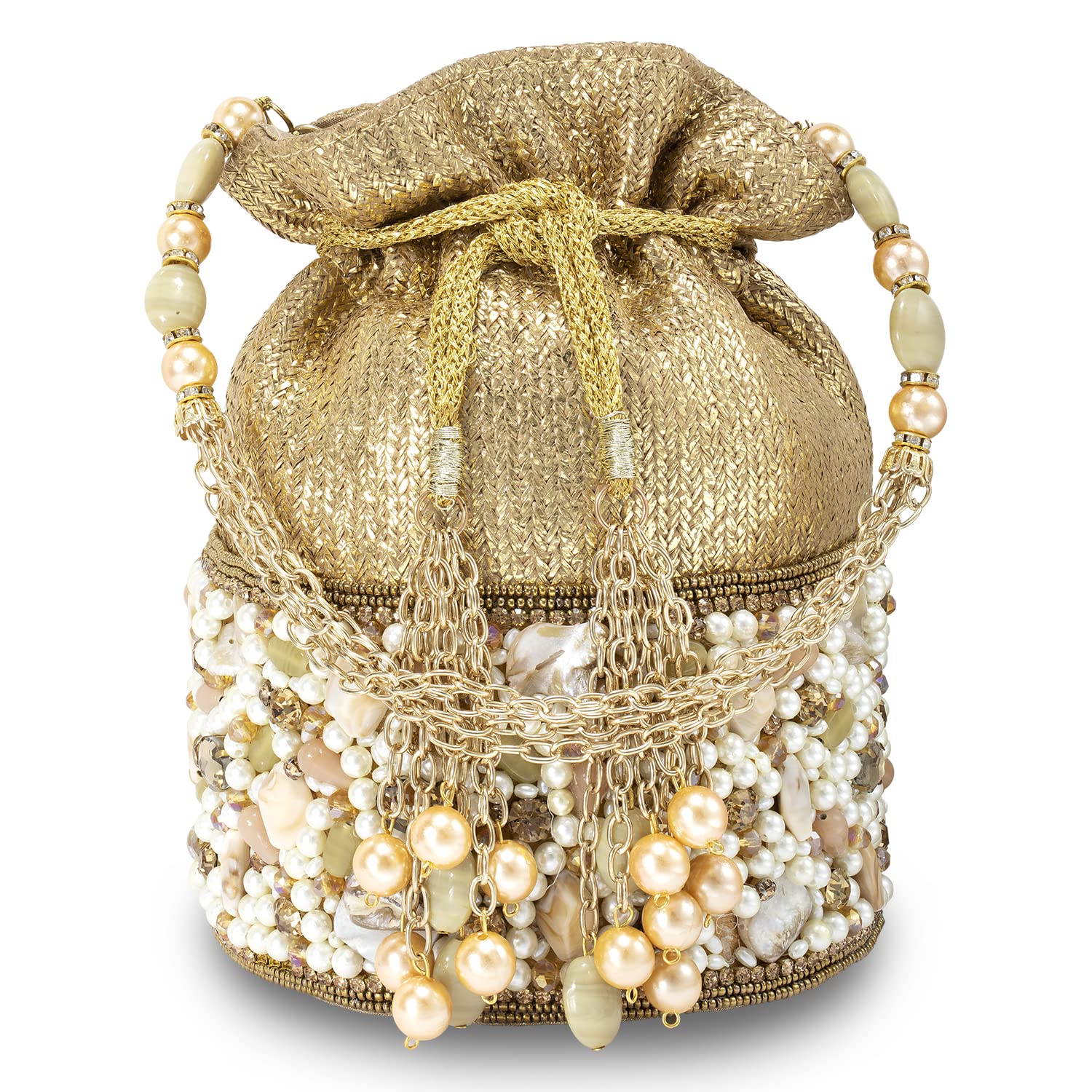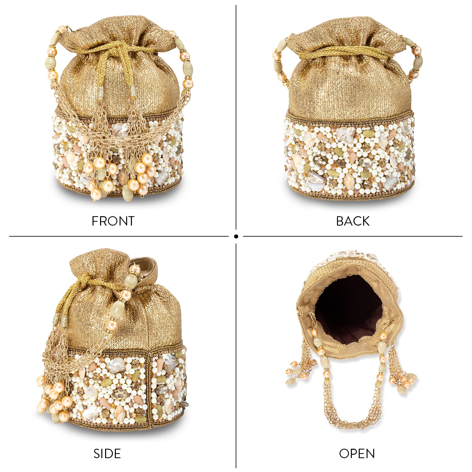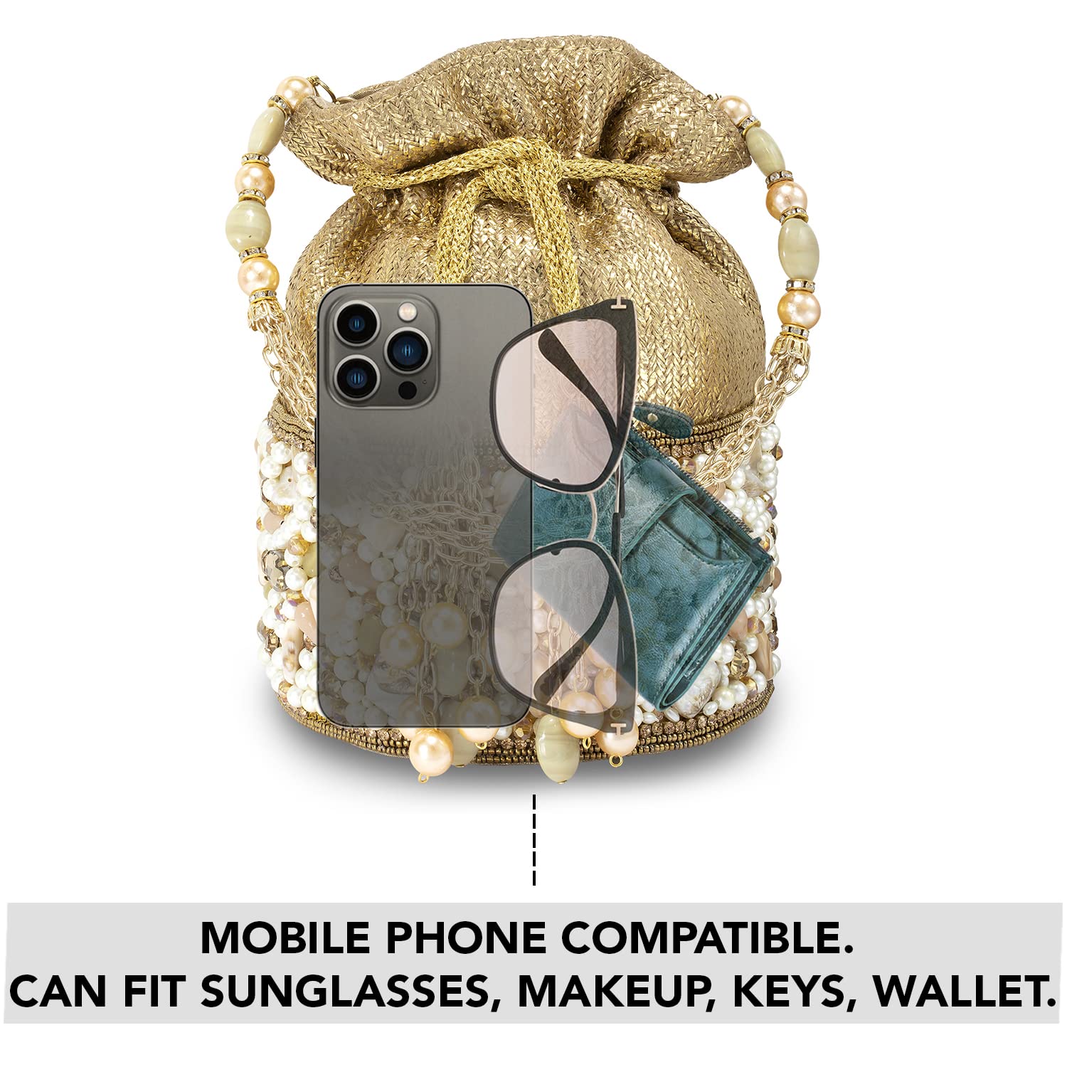 - DESIGN: Embellished with Indian hand work, the soft fabric interior of the evening bag has enough room to keep your credit card, cash, and other small essentials like mobile phones, lipstick, highlighter, keys. The beaded bag comes with tassel dori drawstring and pearl handle.