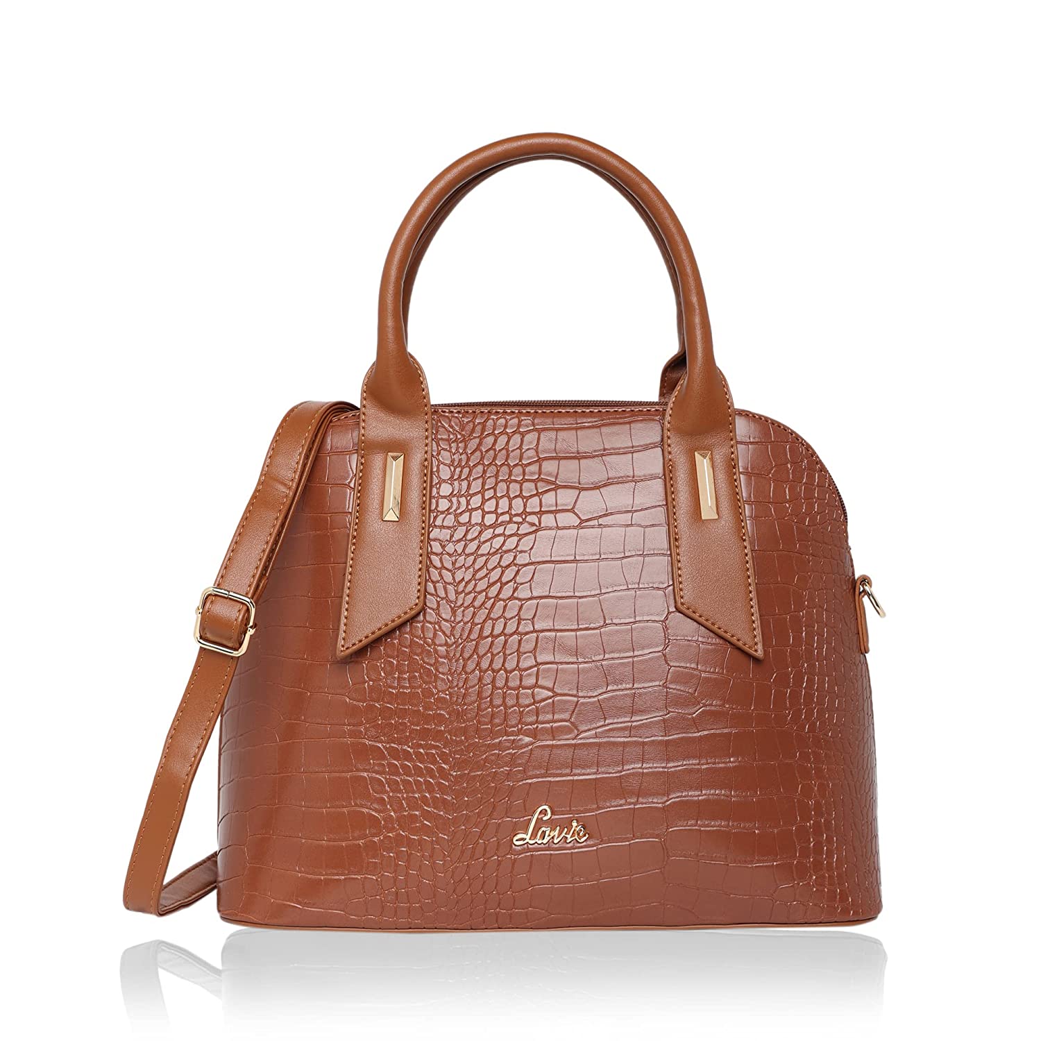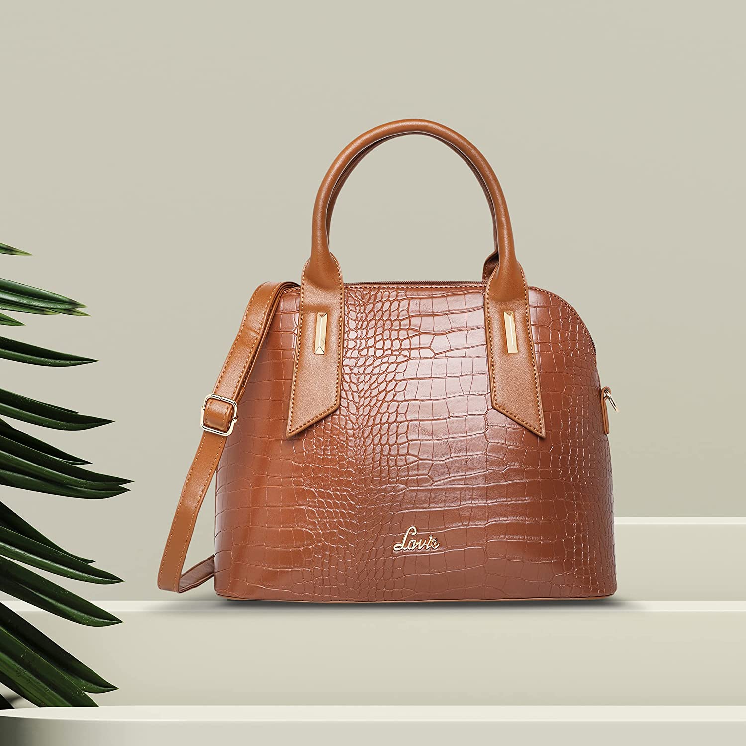 • Glossy Croc texture satchel with back pocket with dome shape