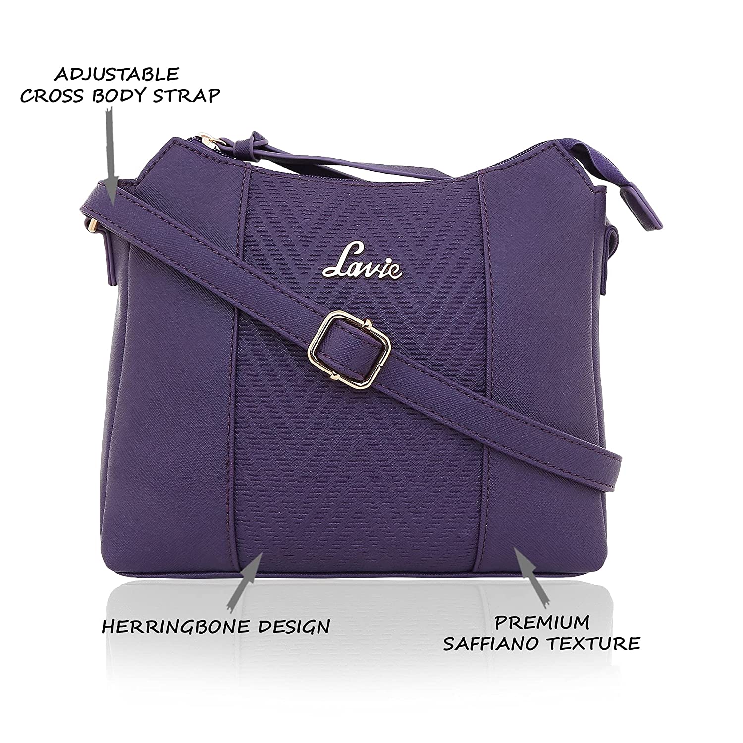 • Purple sling bag with herringbone texture on the front panel