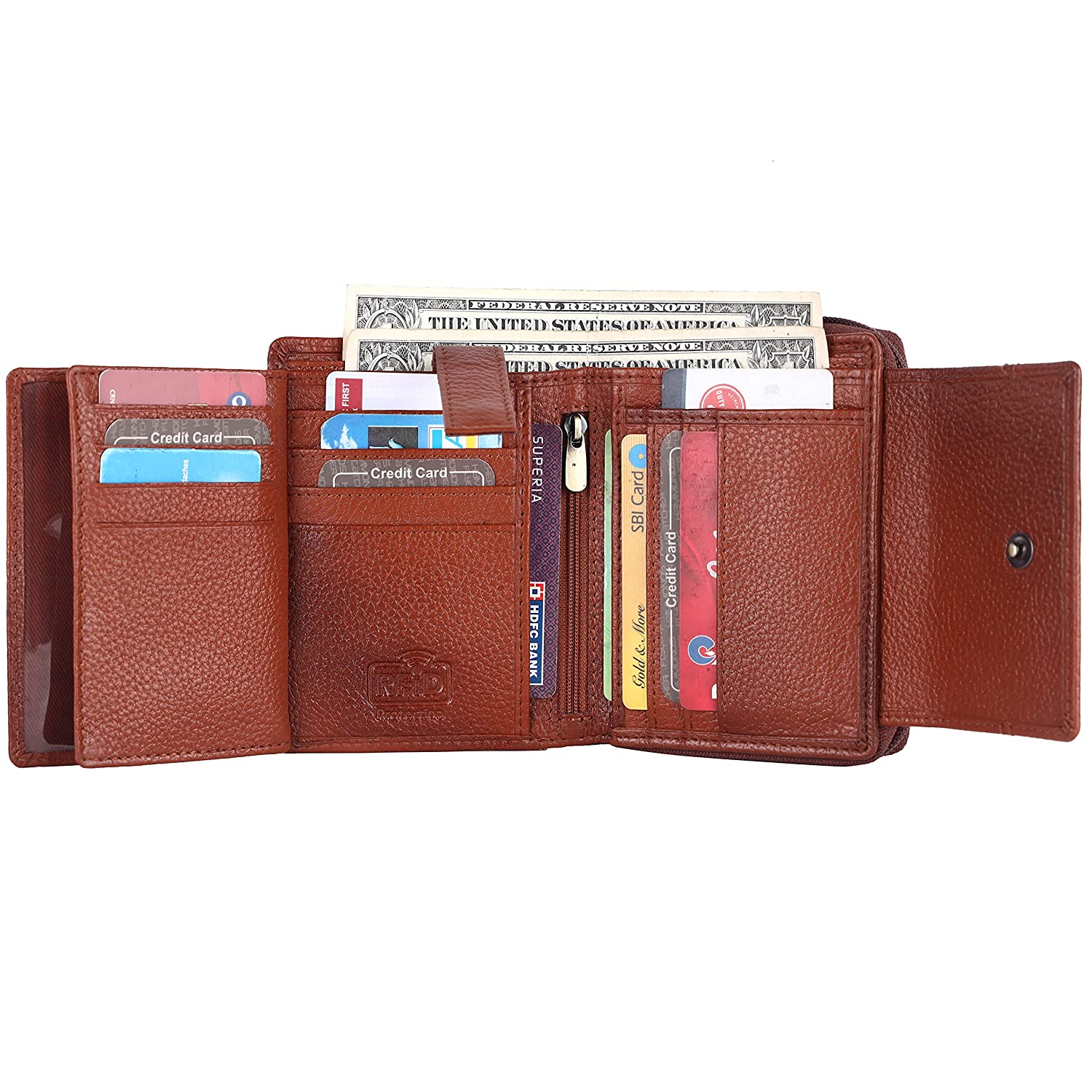 • PLENTY OF ROOM : The ladies purse leather has 14 slots easily load your driver's license, credit cards, debit cards and membership cards, making your work and travel more convenient.; FEATURES OF LADIES PURSE LEATHER: This Women Purse has 14 Cards Slots | RFID Protection | 3 ID Slots | 2 Currency Compartments | 2 Zipper Pockets | 1 Coin's Pocket | 2 Hidden Slots | Button Closure | Metal Logo