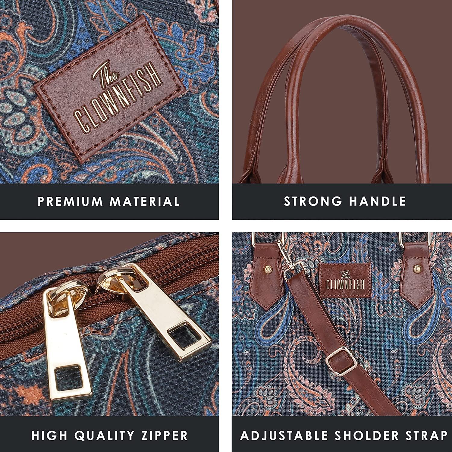 - PREMIUM MATERIAL: This handbag is made in a combination of premium faux leather and Printed Handicraft Fabric material. For the inner lining soft feel polyester fabric is used. Comes with durable reinforced fittings like zippers, buckles.