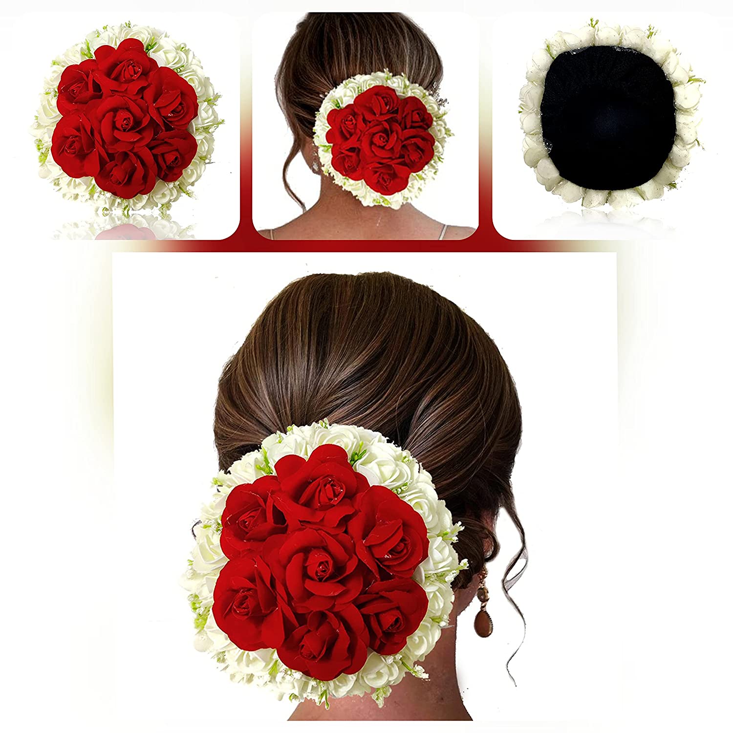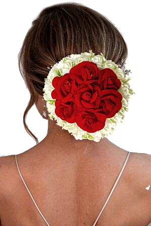 Artificial Floral Design with Red and White Roses Hairpin/Judapin/Juda Bun Bridal Hair Accessories For Women and Girls 2240, Red, Pack of 1
