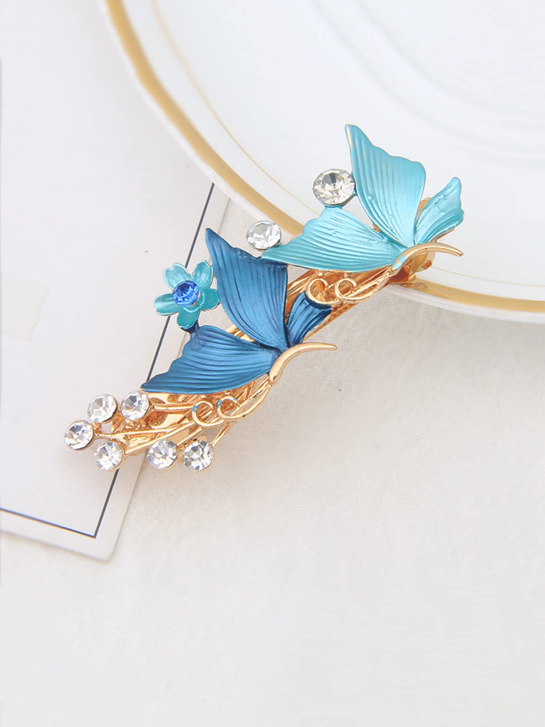 • Gold toned Butterfly clips for women french barrette hair clips for women in enameled Blue butterfly hair accessories for women stylish Wear. A must have piece in your fashion wardrobe. French barrette clips are classic, they never go out of style, and let you design your hairstyle in many ways you want.