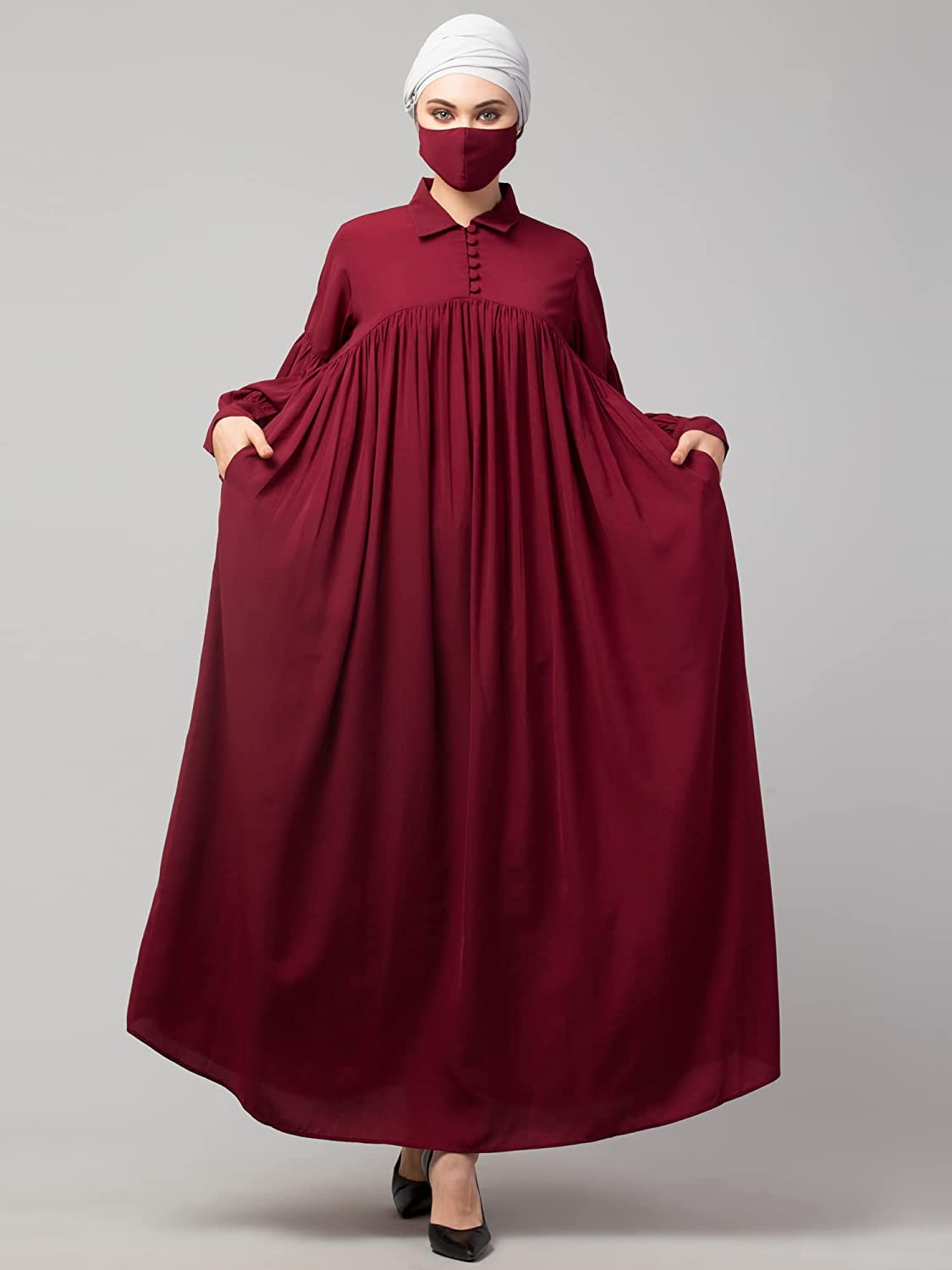 - Size and Fittings: Style name: Abaya | Collar Style: Shirt Collar I Sleeve Style: Balloon Sleeves | Fit: Abaya Fit (Please refer to the size chart) | Standard Length: 56 Inch (Length can be CUSTOMISED: For customized length please drop a message to seller with your desired length)