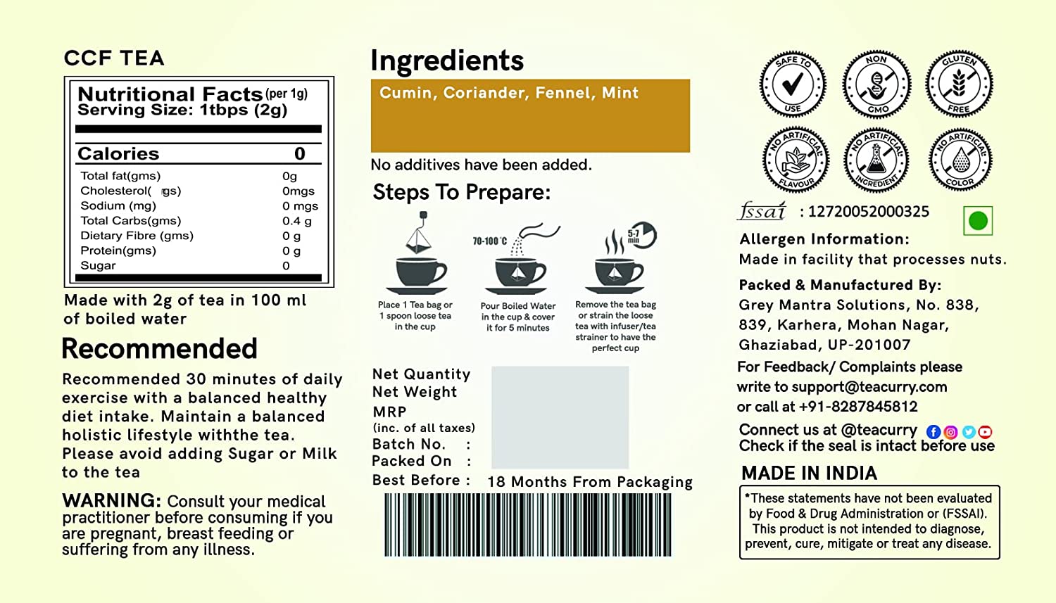 • Magical Infusion of Organic CCF Tea - TeaCurry brings you the freshness of the tea leaves by ensuring we package it garden-fresh. Our teas are heat-sealed with aluminium foil to retain their freshness and aroma at all the times. TeaCurry teas taste as if you are sitting right in the lap of nature and having that perfect fresh sip.