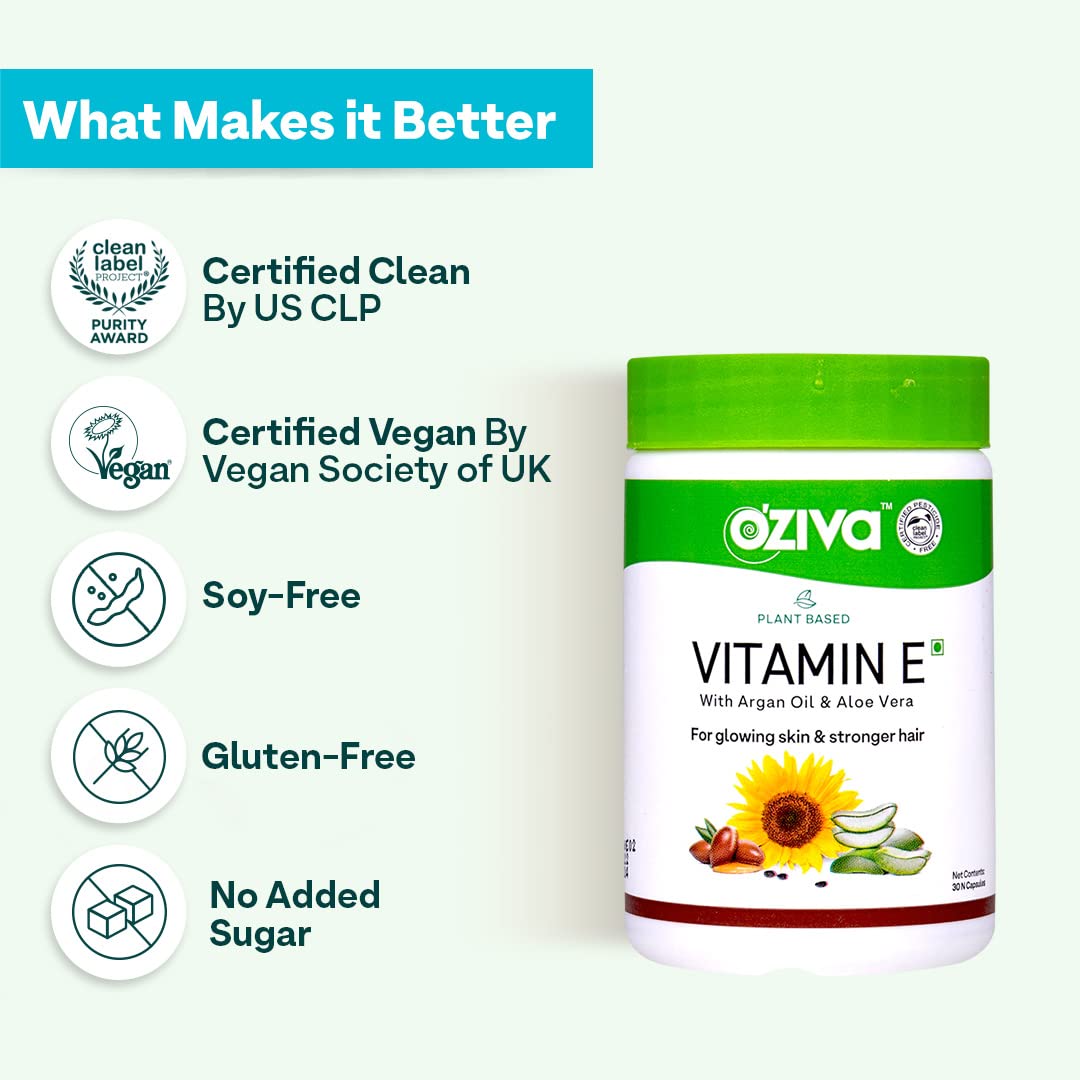 • HAR TARAH SE BETTER WITH CLEAN & PLANT-BASED VITAMIN E CAPSULES: OZiva Plant Based Vitamin E are soy-free and gluten-free vitamin e capsules for face and hair that contain no added sugar or artificial sweeteners, making them absolutely safe for long term consumption. It is 100% plant-based and is Certified Clean by the US CLP, tested and cleared for over 300 contaminants. It is also Certified Vegan by the Vegan Society of UK.